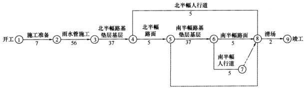 问题 背景材料 某公司中标城市沿海主干道路改建工程标段,道路东西走向,全长973.5m,车行道宽度15m,两边人行道各3m;与道路中心线平行且向北,需新建DN800mm、雨水管道950m。新建路面结构:150mm厚砾石砂垫层,350mm厚二灰混合料基层,80mm厚中粒式沥青混凝土,40mm厚SMA改性沥青混凝土面层。合同规定的开工日期为5月5日,竣工日期为当年9月30日。合同要求施工期间维持半幅交通,工程施工时正值高温台风季节。项目部在施工组织设计获得批准后,开始施工。施工组织设计中绘制了以下的总网络计划图: 图中施工时间中已包含旧路翻挖、砌筑路缘石的施工时间;二灰混合料基层雨期施工施工组织如下:混合料含水量根据气候适当调整,使运到施工现场的混合料接近最佳含水量;关注天气预报,以预防为主。为保证SMA改性沥青面层施工质量,施工方案要求:摊铺温度不低于160℃,初压开始温度不低于150℃,碾压终了的表面温度不低于90℃;采用振动压路机,由低处向高处碾压,不得用轮胎压路机碾压。 问题: 1.指出本工程总网络图计划中的关键线路。 2.将本工程总网络计划改成横道图。 3.根据总网络图,指出可采用流水施工压缩工期的分项工程。 4.给出雨期路基施工的主要措施。 5.补充SMA改性沥青面层碾压施工技术要点。