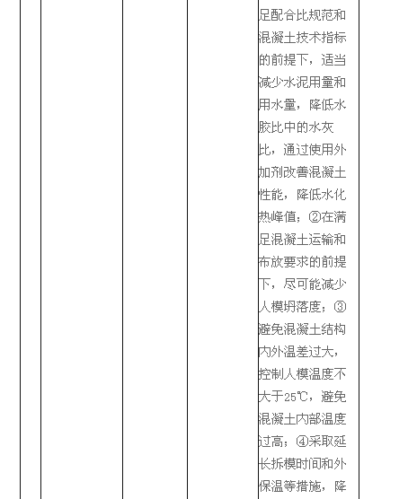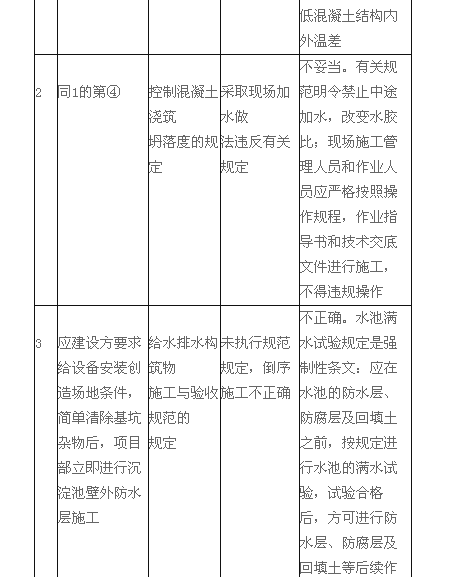问题 某污水处理厂扩建工程,其中钢筋混凝土沉淀池长48m,宽22m;基础底板和墙体混凝土设计强度等级C30,抗渗等级P8,池壁边墙高6m,厚500mm;结构设计沿长度方向在池壁中间设一道伸缩缝。由于基坑开挖处理计划工期拖后,结构施工已进入暑期。为改善混凝土的和易性,施工项目技术负责人将水泥由计算用量324kg/m3增至354kg/m3,选用坍落度为20~22cm;池壁浇筑当日气温最高为36℃,混凝土入模的测试温度实测27℃。现场的一车混凝土因等待时间过长,坍落度损失较大,泵送困难。泵车司机与现场施工员商定加水复拌,恢复坍落度后泵送作业。 池壁浇筑完毕,随即采用喷水湿润的方式对池壁混凝土进行养护,拆模后发现有数条纵向分布的宽达0.2mm裂缝。 应建设方要求给设备安装创造场地条件,简单清除基坑杂物后,项目部立即进行沉淀池壁外防水层施工;在回填土前约请了现场监理查验防水层后,基坑一侧开始土方的回填作业。 问题: 见精选案例7分析表中内容: 精选案例7分析表