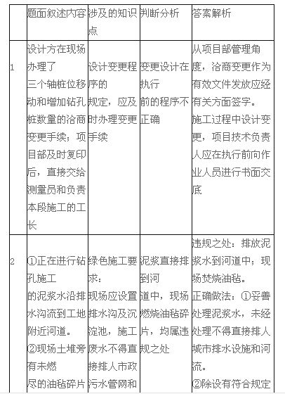问题 A公司承建跨线立交桥工程,桥梁全长782.4m,共计26跨,桥梁下部结构有240棵直径1.2m的钻孔灌注桩,采用反循环钻机成孔。项目部经招标程序将钻孔作业分项工程分包给B公司,签订了分包合同。施工过程中现场发生如下事件: 事件一:因地下管线改移困难,设计方在现场决定8、9、10轴桩位移动并增加钻孔桩数量,立即办理了洽商变更手续。项目部及时复印后,直接交给测量员和负责本段施工的工长。 事件二:项目部在现场文明施工检查中发现原有泥浆沉淀池已淤积,致使钻孔施工的泥浆水沿排水沟流到工地附近的河道里,现场土堆旁有未燃尽的油毡碎片。 事件三:B公司液压吊车起吊钢筋笼时,因钢筋笼的U形吊环与主筋焊接不牢,起吊过程中钢筋笼突然倾倒;幸亏作业人员及时避开,但将泥浆搅拌棚砸坏。项目负责人组织人员清理现场,并开展事故调查分析,对分包方进行罚款处理,调查报告完成后,经项目负责人签字,上报了