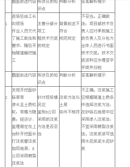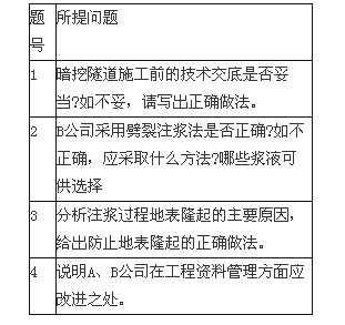 问题 某供热管线暗挖隧道工程,长2.8km,断面尺寸3.8m*3.Om,埋深6m。隧道穿越砂土层和部分砂砾层,除局部有浅层滞水,无须工程降水。承包方A公司通过招标将5#~6#井段穿越砂砾层地层长318m的隧道开挖及初次支护分包给B专业公司。 B公司依据A公司的施工组织设计,进场后由工长向现场作业人员交代了施工做法和要求,随后开始隧道暗挖支护的施工。 施工中B公司在掘进到76m时,发现开挖面砂砾层有渗水且土质松散,有塌方隐患。B公司立即向A公司汇报。经与设计、监理现场商定,决定采用在上台阶开挖面补打注浆管注浆加固地层措施。B公司采用劈裂注浆法,根据以往经验确定注浆量和注浆压力,注浆过程中地面监测发现地表有隆起现象。随后A公司派有经验的专业人员协助B公司现场解决技术问题。 质量监督部门在施工过程监督检查时,发现