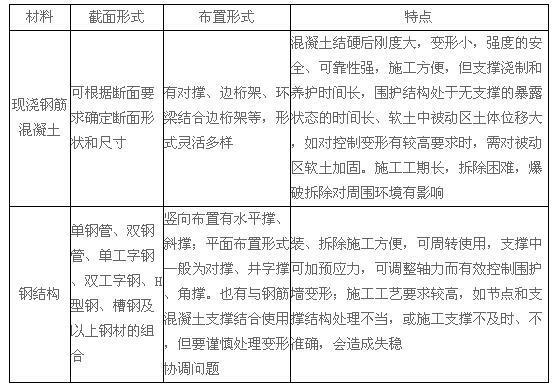 解析 考点应为软弱土层基坑支撑施工内容,具体内容包括: (1)内支撑有钢撑、钢管撑、钢筋混凝土撑、钢与混凝土的混合支撑等;外拉锚有拉锚和土锚两种形式。 (2)在软弱地层的基坑工程中,支撑结构承受围护墙所传递的土压力、水压力。支撑结构挡土的应力传递路径是围护(桩)墙一围檩(冠梁)一支撑;在地质条件较好的有锚固力的地层中,基坑支撑可采用土锚和拉锚等外拉锚形式。 (3)在深基坑的施工支护结构中,常用的支撑系统按其材料可分为现浇钢筋混凝土和钢结构支撑形式,两类形式和特点对照见下表: 两类支撑体系的形式和特点对照表 现浇钢筋混凝土支撑体系由围檩(圈梁)、支撑及角撑、立柱和围檩托架或吊筋、立柱、托架锚固件等其他附属构件组成。钢结构支撑(钢管、型钢支撑)体系通常为装配式的,由围檩、角撑、支撑、预应力设备(包括千斤顶自动调压或人工调压装置)、轴力传感器、支撑体系监测监控装置、立柱桩及其他附属装配式构件组成。