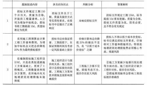 选项 A 公司为增加中标机会,投标书将工期提前10d,质量标准定为优质。采用施工图预算法计算各分部分项工程工作量和费用后,为增加中标机会又把总价降低25% 作为最终投标报价。在编制投标施工组织设计时,为节省时间,在类似道路施工方案基础上,更改了工程概况、工程数量表和部分方案图,但农田地内有关池塘淤泥处理措施未能体现。 2.问题及解答:见精选案例2 分析表中内容: