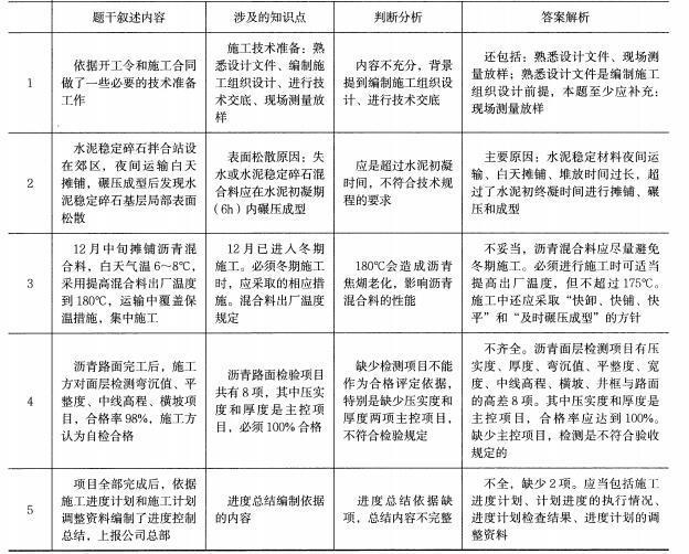 问题 1.背景:某城镇道路扩建工程属城市次干路,长3800m,路宽16.5m,位于城市环路以内,设计结构为:30cm 厚9% 石灰土处理土基,12% 石灰土底基层,35cm 水泥稳定碎石基层,12cm 沥青混凝土面层。施工项目部入场后依据开工指令和施工合同进行了必要的准备工作,编制了施工组织设计,经安全技术交底后开始道路施工。水泥稳定碎石基层材料经招标选定一家材料公司供应。受城市交通管制和环境保护要求,项目部采用夜间运输基层材料,白天摊铺碾压,成型后发现水泥稳定基层局部表面松散。由于拆迁延期,有一段沥青混合料路面延至12 月中旬摊铺;项目部选择白天气温较高(6~8℃)时段,采取提高沥青混合料出厂温度到180℃,运输中覆盖保温等保证措施,集中施工道路面层。沥青混合料面层竣工后,施工方进行了道路外观检查,并检测了弯沉值、平整度、中线高程、横坡项目,合格率达到98%,施工方认为工程质量自检合格。在工程施工全部完成后,项目部依据施工进度计划和计划调整资料编制了进度控制总结,上报公司工程管理部。◆239 2.问题及解答:见精选案例1 分析表中内容: