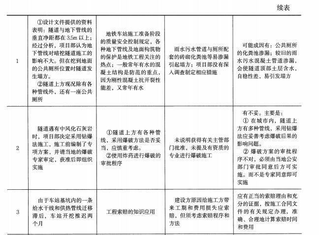 问题 1.背景:某公司承建城市地铁工程标段,包含一段双线区间和一个车站,区间隧道及风道出入口采用暗挖法施工,车站的主体结构采用明开法施工。区间隧道上方为现况道路,路宽22.5m,道路沿线的地下埋设有雨水污水、天然气、电信、供热等管线,还有一座公共厕所。隧道埋深15m 左右,并穿越长度100m 左右的中风化石灰岩。岩层以上分别为黏土2m,砂卵石5~7m,粉细砂2m,粉质黏土3m,回填土2~2.5m。施工日志显示如下事件:事件一、设计文件提供的资料表明:隧道与地下管线的垂直净距都在3.5m 以上;经过分析,项目部认为地下管线对暗挖隧道施工的影响不大。但在挖到地面的公共厕所位置时隧道发生塌方。事件二、隧道遇有中风化石灰岩时,项目部决定采用钻爆法施工,施工前编制了专项方案,并请当地的爆破专家审定,获准后即组织实施。事件三、由于车站基坑内的一条给水干线和供热管线迁移滞后,车站开挖推迟两个月。事件四、隧道实际长度比清单长度少1.5m,监理工程师要求项目部扣除1.5m 的长度。 2.问题及解答:见精选案例5 分析表中内容: