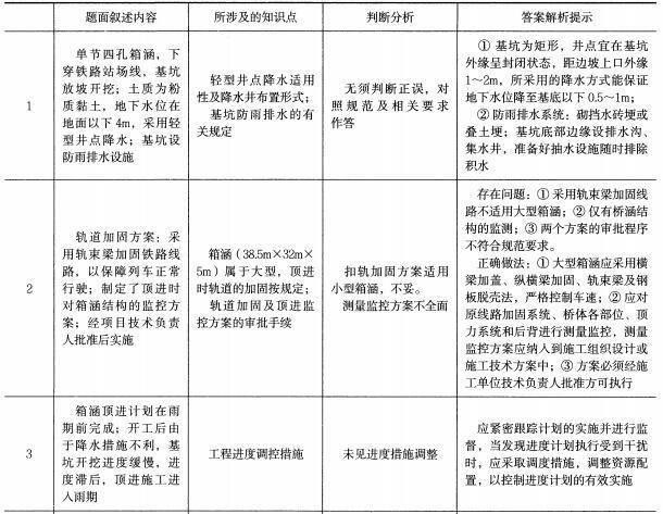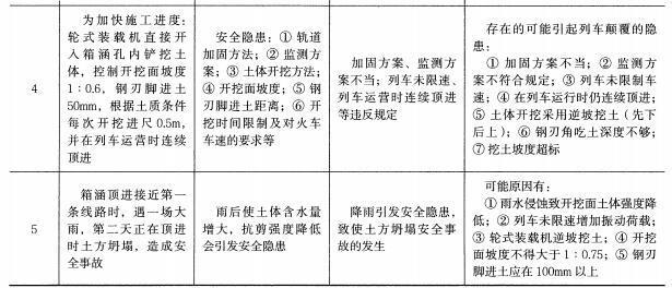 问题 1.背景:某市主干道下穿铁路站场线采用顶进箱涵施工,箱涵设计:单节箱涵四孔道,总宽32m,高5m,总长度38.5m,为现浇钢筋混凝土结构,箱涵前端设斜面钢刃角。箱涵预制工作坑土质为粉质黏土、地下水位于地面以下4m,基坑采用放坡明挖和轻型井点降水,并设置了防雨排水设施,计划6 月10 日雨期开始前实现顶进就位。项目部编制轨道加固方案,采用轨束梁加固铁路线路,以保障列车按正常速度行驶;制定了顶进时对箱涵结构的监控方案,经项目部技术负责人批准后实施。开工后,由于降水措施不利,工作坑开挖进度缓慢,进度计划滞后。预制箱涵达到设计强度并完成顶进后背的制作时,顶进施工进入雨期。为加快施工进度,项目部采用轮式装载机直接开入箱涵孔内铲挖土体,控制开挖面坡度为1∶0.6,钢刃脚进土50mm,根据土质条件每次开挖进尺0.5m,并在列车运营时连续顶进。箱涵顶进接近第一条线路时,夜间遇一场大雨,第二天正在顶进时,开挖面土方坍塌,造成安全事故。 2.问题及解答:见精选案例9 分析表中内容: