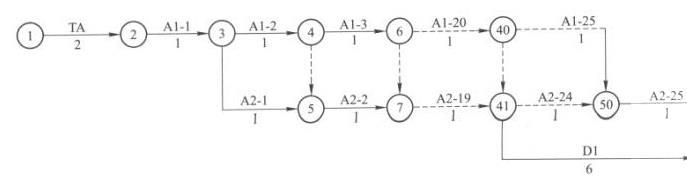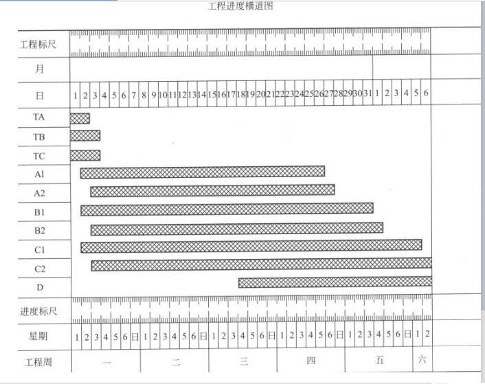 解析 (1)本工程各项工作的排列顺序为:路由复测挖沟及处理障碍—放缆回填及标石埋设—接续(光缆接续、成端接续)—测试—整理(汇总)竣工资料。 (2)对于光缆接续工作,按照不同的施工条件、监测方式,可能将接头的接续放在前边,也可能将成端的接续放在前边。如果ODF架已经安装完毕,局端光缆已经敷设完成时,可先接续成端光缆,采用单向法对接头进行监测;此时,也可以采用双向法对每个光缆接头进行双向监测。当局端光缆不具备施工条件时,只能采用双向监测法先接续光缆接头,最后待成端具备接续条件时,再完成光缆成端接续工作。 (3)项目经理部首先将此工程分解为3个中继段,然后将每个中继段的工作进一步分解为路由复测、挖沟及处理障碍、放缆回填及标石埋设、光缆接续及全程测试等项工作。 (4)此工程项目经理部采用流水作业法合适。因为采用流水作业法的条件是:①可以把工程的施工分为若干个过程,每个过程分别由固定的作业队负责完成。②可以把工程划分为劳动量大致相等的施工段(也称流水段)。③各作业段施工持续的时间相近。④各作业队按一定的施工工艺要求配备必要的施工资源,依次性、连续性地由一个施工段转移到另一个施工段,反复地完成同类工作。⑤各作业队完成各施工过程的时间可以适当地搭接起来。在项目经理部安排的流水作业中,上述条件都具备,所以可以采用流水作业法安排施工。 (5)在考虑工序搭接的情况下,按工期最短(时间按整天考虑)、费用最低的要求,绘制此工程包含路由复测、挖沟及障碍处理、放缆回填及埋设标石、接续及测试的横道图如下: (6)如果时间按整天考虑,各中继段的作业组正常施工,在考虑流水作业的情况下,A组的工作可以分解为A1-n(A中继段第一作业组第n天的工作)、A2-n(A中继段第二作业组第n天的工作);当A中继段光缆接续、测试需要的时间D1=6天时,A中继段的双代号网络图如下图: (7)影响本工程进度的因素可能有外部的影响因素和施工单位内部的影响因素。①外部影响进度的因素可能有:建设单位的配套机房未建好;材料不能按时到货或到货材料有质量问题;施工单位得不到急需的建设资金;建设单位不能及时提供满足要求的施工图设计;政府的重要会议、大型活动、重要节假日禁止施工;交通不便;当地居民阻止施工等。②施工单位内部影响进度的因素可能有:对突发情况应对不力;为工程配备的熔接设备和仪表不能满足工程的需要;投入的技术力量不能满足工程需要,如光缆接续人员技术不熟、生手太多;施工过程中,因质量问题造成大量返工;施工现场资金紧缺;施工过程中发生安全事故等。 (8)项目经理部在进行进度控制时,应按照事前、事中、事后的过程方法工作。项目经理部应在施工准备阶段编制工程项目进度计划。在施工过程中应将此计划落实下去,要求现场作业班组按照此计划安排施工;施工过程中,项目经理部还应对工程进度实行动态控制,检查实际进度与计划进度的偏差,发现偏差应及时分析原因,采取相应的纠正措施,保证工程项目在合同规定的工期内完成。 (9)如果施工进度延误,项目经理部应通过分析延误进度的原因,找出调整进度的方法。在调整进度时,可考虑下列方法:①及时消除影响进度的因素;②增加施工人员或延长施工人员的劳动时间;③增加施工机具、设备、仪表或倒班作业;④改变某些工作间的逻辑关系;⑤缩短某些工作的持续时间。调整进度偏差时,还应考虑调整成本。