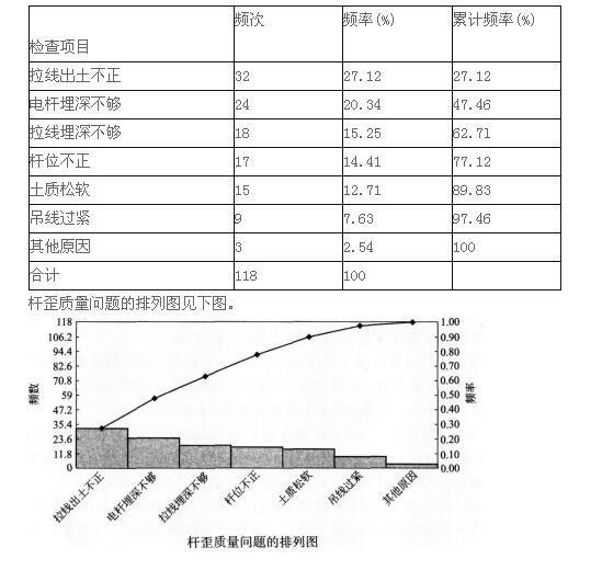 问题 1.背景 通过对某架空线路工程质量问题的调查,统计导致杆歪的原因有:电杆埋深不够24处,拉线出土不正32处,拉线埋深不够18处,土质松软15处,吊线过紧9处,杆位不正17处,其他原因3处。 2.问题 (1)绘制杆歪质量问题排列表,画出杆歪质量问题的排列图,并分析造成杆歪问题的主要原因是什么? (2)用因果分析法分析拉线埋深不够的原因。 (3)如何控制立杆的质量? (4)如何通过控制操作者的工作质量保证立杆的质量?