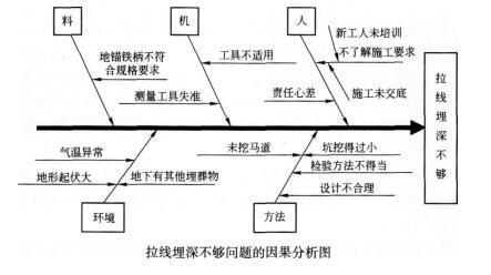 解析 (1)杆歪质量问题排列表 由图中可以看出,由于拉线出土不正、电杆埋深不够、拉线埋深不够、杆位不正等问题发生的频率在0~80%这个范围内,因此,造成杆歪问题的主要原因是: ①拉线出土不正 ②电杆埋深不够 ③拉线埋深不够 ④杆位不正 (2)拉线埋深不够问题的因果分析图如下图 (3)影响立杆质量的因素在排列图中已找到,应重点控制这些影响因素,保证立杆的质量,作业人员应按照管理体系的要求施工;依据设计、规范、作业指导书等要求进行作业;在施工过程中应做好“三检”工作;对于发现的问题应及时整改,并制定纠正及预防措施,避免再次出现类似问题。 (4)要通过控制操作者的工作质量来保证立杆的质量,就应对作业者进行岗前培训,明确其职责和权限,增强其事业心和责任感,自觉地做好分内工作,建立岗位责任制,完善考核制度,合理使用人才,充分调动人的积极性。通过在认识上、水平上提高操作者的质量意识,从而保证立杆的质量。