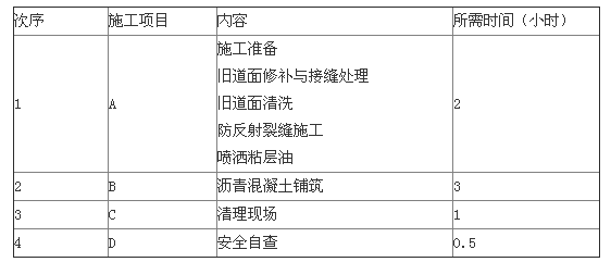 背景资料:某机场实施跑道道面沥青混凝土加层整修工程的不停航施工,机场关闭时间为当日23:00~次日6:00。该工程施工项目及每班所需时间见下表。注...
