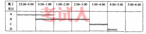 问题 背景资料:某机场实施跑道道面沥青混凝土加层整修工程的不停航施工,机场关闭时间为当日23:00~次日6:00。该工程施工项目及每班所需时间见下表。 注:1.A项目结束前1小时,B项目才能开始。   2.