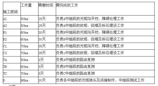 1.背景某项目经理部负责某本地网直埋光缆线路环网工程的施工,合同规定采用包工不包料的方式承包,工程的路由报建工作已由建设单位完成,工程定于4月15日开...