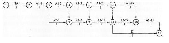 解析 (1)本工程各项主要工作的排列顺序为:路由复测——挖沟及处理障碍——放缆——回填及标石埋设——接续(光缆接续、成端制作)——中继段测试——整理(汇总)竣工资料。 (2)对于光缆接头及成端制作,按照不同的施工条件、不同的监测方式,可以将接头制作放在前边,也可以将成端制作放在前边。如果ODF架已经安装完毕、局端光缆已经敷设完成时,可先进行成端制作,然后采用单向法对光缆接头进行监测,此时也可以采用双向法对每个光缆接头进行双向监测。当局端光缆不具备施工条件时,只能先进行光缆接头制作,采用双向监测法监测,最后待具备条件时再完成光缆成端制作工作。 (3)项目经理部首先将此工程分解为三个中继段,然后将每个中继段的工作进一步分解为路由复测、挖沟及处理障碍、放缆回填及标石埋设、光缆接续及全程测试等项工作。 (4)本工程项目经理部采用流水作业法合适。采用流水作业法的条件是: ①可以把工程的施工分为若干个过程,每个过程分别由固定的作业队负责完成。 ②可以把工程划分为劳动量大致相等的施工段(也称流水段)。 ③各作业段施工持续的时间相近。 ④各作业队按一定的施工工艺要求配备必要的施工资源,依次性地、连续性地由一个施工段转移到另一个施工段,反复地完成同类工作。 ⑤各作业队完成各施工过程的时间可以适当地搭接起来。 (5)在考虑工序搭接的情况下,要求工期最短(时间按整天考虑)、费用最低,绘制的本工程包含路由复测、挖沟及障碍处理、放缆回填及埋设标石、接续及测试的横道图如下: (6)如果时间按整天考虑,各中继段的作业组正常施工,在考虑流水作业的情况下,A组的工作可以分解为A1-n(A中继段第一作业组第n天的工作)、A2-n(A中继段第二作业组第n天的工作);当A中继段光缆接续、测试需要的时间D1=6天时,A中继段的双代号网络图如下图: (7)影响本工程进度的可能因素有外部因素和施工单位的内部影响因素。 ①外部因素有:建设单位的配套机房未建好;材料不能按时到货或到货材料有质量问题;施工单位得不到急需的建设资金;建设单位不能及时提供满足要求的施工图设计;政府的重要会议、大型活动、重要节假日禁止施工;交通不便;当地居民阻止施工等。 ②施工单位的内部影响因素有:对突发情况应对不力;为工程配备的熔接设备和仪表不能满足工程的需要;投入的技术力量不能满足工程需要,如光缆接续人员技术不熟,生手太多;施工过程中,因质量问题造成大量返工;施工现场资金紧缺;施工过程中发生安全事故等。 (8)项目经理部在进行进度控制时,应按照事前、事中、事后的过程方法工作。项目经理部应在施工准备阶段编制出工程项目进度计划。在施工过程中应将此计划落实下去,要求现场作业班组按照此计划安排施工;施工过程中,项目经理部还应对工程进度实行动态控制,检查实际进度与计划进度的偏差,发现偏差应及时分析原因,采取相应的纠正措施,保证工程项目在合同规定的工期内完成。 (9)如果施工进度延误,项目经理部应通过分析延误进度的原因,找出调整进度的方法。在调整进度时,可考虑下列方法,调整进度偏差时还应考虑调整成本: ①及时消除影响进度的因素 ②增加施工人员或延长施工人员的劳动时间 ③增加施工机具、设备、仪表或倒班作业 ④改变某些工作间的逻辑关系 ⑤缩短某些工作的持续时间
