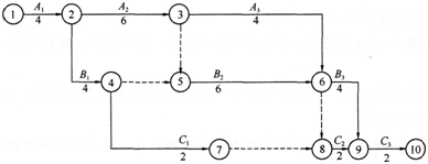 解析 1.施工进度计划横道图如下: 施工进度计划网络图如下: 2.只有一条关键线路,关键线路为 关键线路即施工过程中(最早开始、最早结束)连续工期持续最长的线路。 3.C1工作延误3周,不影响总工期。因为C1工作到允许最晚结束的时差有6周时间,延误3周(迟开工3周或拖延3周结束)都不影响C2工作最早开始的时间,不影响总工期。或者C1工作不在关键线路上,它的延误时间也不影响其他关键线路上工作的开始和结束时间。 此时总工期仍为22周。 4.B1工作延误3周,影响总工期,延长1周。 B1工作最早结束到最晚结束允许的时间差只有2周,而B1工作延误3周,致使关键线路上的B2工作最早开始时间和允许的最迟结束时间推迟1周。总工期推迟1周。 此时总工期为23周。