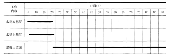 解析 (1)不妥当。根据民航施工规范,水稳基层施工后必须至少养护7d之后方可进行上部工序的施工,横道图中显示,水稳底基层施工完成5d后即进行上基层施工,养护期不够;而水稳上基层施工完成后15d后方可进行混凝土道面施工,超出了规定的养护期,造成了工期浪费。 (2)横道图的缺点:工作之间的逻辑关系不易表达清楚;没有通过严谨的进度计划时间参数计算,不能确定计划的关键工作、关键线路与时差;计划调整只能用手工方式进行,其工作量较大;难以适应大的进度计划系统。 (3)施工进度控制的主要程序为:目标一计划一实施一监测一调整一完成。