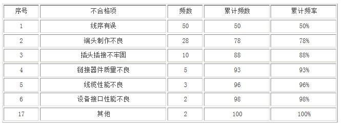 问题 某项目部承担了一项程控交换设备安装工程,采用包工不包料方式承包,约定工期40 。 开工前,项目部指派技术员进行现场勘察,明确了施工用电机空调设施、现场的特殊要求等情况,同时根据施工图设计对机房地板、需安装设备位置及数量等进行复核。 工程硬件安装完成后进行了用户线缆测试,发现了很多质量问题,用户线缆测试不合格项统计表如下: 问题 1.列出施工机房现场勘察还应包括的主要内容。 2.列出施工图设计现场复核还应包括的主要内容。 3.做出用户线缆测试不合格项排列表。 4.做出用户线缆测试不合格项排列图。 5.分析用户线缆测试不合格的主要原因并提出改进措施。 6.施工单位最终提交的竣工资料应包含哪几部分?