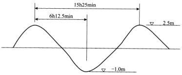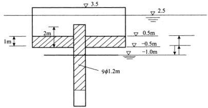 解析 (1)承台混凝土的浇筑量:10*10*4-9*3.14*0.62*2=379.6m3。承台底层混凝土浇筑量:10*10*1-9*3.14*0.62*1=89.8m3。 (2)在落潮的过程中,当潮位落至-0.5m(承台底模板刚露出水面)时开始浇筑混凝土对赶潮水施工最为有利。 3) 【第一种思路】 潮水从+2.5m降至-1.0m(总计3.5m)的时间是6h12.5min(6.21h)。潮水每涨(落)1m所需时间为:6.21/3.5=1.77h。潮水从-0.5m落至-1.0m再涨至+0.5m(底层混凝土顶面)所需时间:1.77*(0.5+0.5+1.0)=3.54h。用有效生产能力50m3/h的混凝土拌合船浇筑底层混凝土所需时间:89.8/50=1.8h。底层混凝土浇筑时间与混凝土初凝时间的和为:1.8+1.5=3.3h。3.54h>3.3h,所以用有效生产能力50m3/h的混凝土拌合船浇筑底层混凝土是可以满足规范对赶潮浇筑混凝土施工要求的。 【第二种思路】底层混凝土浇筑完成并初凝结束的时间是:3.3h。3.3h的时间内潮水从-0.5m降至-1.0m再涨至的标高是:(3.3/1.77)-(0.5+0.5+0.5)=1.86-1.5=+0.36m还没有淹没底层混凝土的顶面(+0.5m)。所以是可以满足规范对赶潮浇筑混凝土施工要求的。 (4)备料1)水泥:444*89.8*(1+5%)=41.9t。2)砂:444*1.50*89.8*(1+5%)=62.9t。3)石子:444*2.50*89.8*(1+5%)=104.8t。4)水:444*0.4*89.8*(1+5%)=16.76t。 (5)首选的保证措施是:选用高性能混凝土。