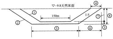 问题 某航道局承担了3万t级航道疏浚工程,用一艘4500m3耙吸船施工。航道设计底标高-12.0m,天然床面标高-9.8m,设计底宽150m,底质为淤泥质土,边坡1:5,计算超深0.7m,计算超宽9m,疏浚工程量计算断面如图所示。设计疏浚工程量为3178157m3(施工期回淤很少,不计),开工前,施工单位按浚前测量的水深图自行计算,并经监理确认的疏浚工程量为3200876m3,疏浚土全部抛到外海指定抛泥区,平均运距16.8km。耙吸船施工参数如下:平均航速8.6节,往返航行时间2.1h,调头卸泥时间0.35h,挖泥装船时间1.2h,装舱量22001T13,三班作业,时间利用率75% 问题: (1)指出疏浚工程量计算断面示意图中①、②的含义和③~⑧项的数值。 (2)列出耙吸船在本工程中的施工工艺流程。 (3)本工程用于计量的疏浚土工程量应为多少?说明理由。该工程量由几部分组成? (4)计算该耙吸船可完成的日疏浚工程量和完成工程的预期作业天数。(各题涉及计算的,要求列出算式及步骤)
