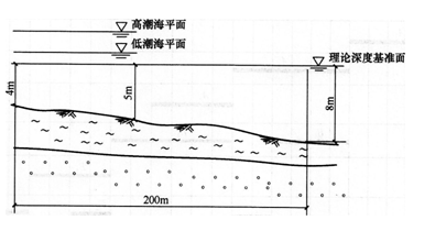 解析 依题意该航道疏浚工程示意图如下: 1.如图所示,将航道沿宽度方向水深<5m的地段,作为一条施工区,低潮时,基本无法施工,应在平均潮位以上时,趁潮施工。 这时4m+2m=6m>5.5m 5m+2m=7m>5.5m施工可以进行 分段的长度以能装满一舱泥为原则。 2.在挖上层2~4m淤泥时,应选用挖掘型耙头,在挖下层中密砂层时,应选用冲刷型耙头。 3.开挖上层淤泥层时,无需采用高压冲水:在开挖下层中密砂层时,采用高压冲水,提高开挖中密砂的效率。 4.在开挖上层淤泥层时,要加大波浪补偿器的压力,以减小耙头对淤泥层的压力;在开挖下层中密砂层时,要减小波浪补偿器的压力,以增大耙头的对地压力,提高开挖效率。