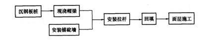 解析 1.本工程主体施工的流程如下: 2.钢板桩沉桩采用的沉桩工艺主要包括: (1)设置导向梁(架); (2)采用一次沉桩或多次往复沉桩方法; a.一次沉桩:每1~2根桩一次打到设计标高; b.往复沉桩:以若干桩为一批,先插立在导梁(架)内,沉桩时先沉两端头1~2根桩,后沉中间其余桩。 3.沉桩过程中可能出现的异常情况及采取的措施: (1)沿板桩墙轴线方向垂直度超标:采用楔形桩方法纠偏; (2)板桩偏移轴线产生平面扭转:在后续沉桩中逐根纠正; (3)沉板桩时将邻近已沉桩“带下”或“上浮”,对“带下”板桩,后沉桩桩顶标高适当提高;对“上浮”板桩复打至设计标高; (4)脱榫或不连锁现象,应与设计单位研究处理。 4.安装拉杆应重点控制: (1)拉杆应搁置在垫平的垫块上; (2)拉杆连接铰的转动轴线应位于水平面上; (3)在帽梁混凝土强度达到设计强度且锚碇墙前回填完成后方可张拉; (4)张紧拉杆时应使拉杆具有设计要求的初始应力; (5)拉杆安装完成后,对防护层进行检查,对涂层缺漏、损坏处进行修补。