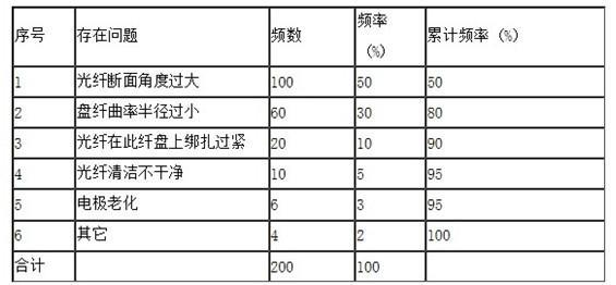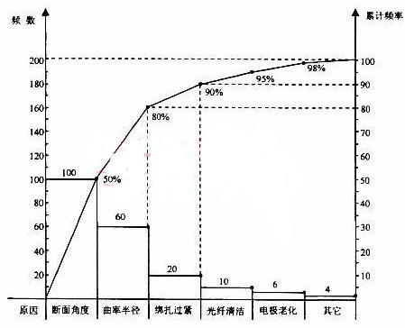 解析 1.(1)安全控制措施(2)环保措施 2.(1)光缆的金属护套、金属加强芯在接头处不作电气连通。 (2)接近电气化铁路地段,光缆的金属护套与加强芯做临时接地,以保证人身安全。 3.预防绝缘不合格: (1)光缆敷设和回填时避免光缆外皮损伤。 (2)接头盒封装严密。 预防打背扣: 按规范操作配备足够敷设人员保证光缆在施工人员的视线范围内 4.光缆接续不合格点顺序排列表 光纤接续不合格点排列图: 累计频率 0-80%为主要原因,即光纤断面角度过大和盘纤曲率半径过小,解决方法为更换光纤切割刀(或刀片),加强培训按要求盘纤以保证光纤的曲率半径。 5.索赔工期:10 天(停工)+5 天(挖沟)=15 天 索赔费用:停工 5 万元,挖沟 5 万元,同沟敷设光缆增加费用 7 万元。合计:5+5+7=17 万元