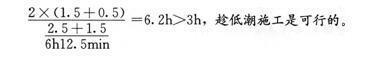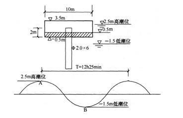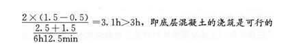 解析 1.必须有足够的混凝土强度保证连续施工,保证混凝土在水位以上振捣;(2)底层混凝土初凝前不宜被水淹没。 2.必须安排进行所要浇筑混凝土初凝时间的试验项目,方可考虑混凝土趁低潮浇筑施工的可能性。 3.以背景资料绘简图示意: 应在潮水从+2.5m落至-0.50m时开始浇筑承台混凝土最为有利。 (1)潮水落至-0.50m时承台底面模板已露出水面,具备混凝土浇筑施工条件; (2)潮水从-0.50m继续落至-1.5m(低潮位)再回升至承台底面(0m)历时最 长,对混凝土浇筑施工最有利。 4.承台底板第一层混凝土浇筑1m厚需要的时间: 10*10*1-3.14*1.02*1*6=100-18.8=81m3 供混凝土与分灰振捣的时间=(81/80)+0.5=1.5h 承台底板第一层混凝土达到初凝需时间=1.5+1.5=3h 潮水从-0.5m降至-1.5m再升至0的历时: 第二层混凝土1m厚浇筑、振捣至初凝的时间为: (81/80)+0.5+1.5=3h 潮水从底层混凝土顶面0.5m落至-1.5m再升至0.5m的历时: