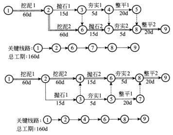解析 (1)选抓扬式或铲斗式或链斗式挖泥船。主要配套船舶有自航泥驳或泥驳、拖轮组。 (2)应在拟开始施工作业次日20d前,向海事局提出通航安全水上水下施工作业的书面申请。 (3) 关键线路:①→②→④→⑥→⑧→⑨总工期:160d(4)从第二段挖泥开始,配足两班船员,进行两班挖泥作业,可将挖泥2的60d工期缩短为30d,总工期可提前30d,满足业主要求。此时关键线路不变,总工期130d。