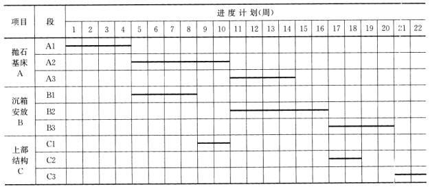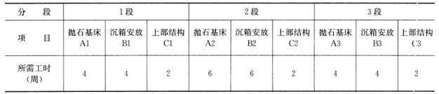 某重力式码头主体工程施工分3个流水段进行,段间、段内施工工艺互无干扰。抛石基床(包括挖泥、抛石、整平)、沉箱安放(包括预制、出运、安装、箱内填料)、上部结...