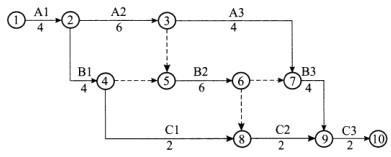 解析 (1) (2)关键线路为:①→②→③→⑤→⑥→⑦→⑨→⑩ (3)不影响总工期,因为C1工作有6周的时差可以机动使用。此时的总工期为22周。 (4)影响总工期,因为B1工作只有2周的时差可以机动使用,总工期将延长1周,为23周。