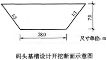 解析 1.依题意绘简图: (1)自沉箱顸向下0.5m范围内为浪溅区(+2.5~+2.0)。 (2)(沉箱顶向下0.5m)至(从沉箱顶向下3m)范围为水位变动区(+2.0~-0.5)为提高沉箱顶部3m混凝土耐久性的首选措施是应用高性能混凝土。 2.依题意绘简图: 计算断面底宽:[(1/3)-0.3]*3*2+28=28.2(m) 计算断面顶宽:28.2+(7+0.3)*3*2=72(m) 码头基槽挖泥的计算断面面积是: [28.2+72]*(7+0.3)/2=365.73(m2) 3.(1)抛石基床整平范围为沉箱底面宽度15m。此项是施工存在的问题之一,基床整平范围应为沉箱底面每边各加宽0.5m。整平范围与沉箱底面宽度15m相同,沉箱安放后,基床边缘受压塌陷沉箱边部悬空,受力不均,不稳定、不安全。 (2)在填砂压载前出现前倾,施工单位采取在沉箱后排仓格内先抛填一半高度砂的措施,进行偏心压载,以调整沉箱就位的做法是错误的。应将沉箱抽水浮起,调整基床重新安装。 4.浮运拖带沉箱前应对沉箱进行吃水、压栽、浮游稳定性验算。 拖运沉箱时,在正常航速条件下,牵引作用点的最佳位置在定倾中心以下10cm左右处最为稳定。 5.2000000/(410*24*0.65)=313(d) 6.在缺陷责任期内,所发生的两起事件中: (1)码头前沿停靠渔船,将橡胶护舷撞坏,是交工后使用单位管理失误所造成,可由使用单位自行修复;也可委托缺陷责任期责任单位修复,但由委托方承担费用。 (2)码头后轨道梁两侧的连锁块局部出现下沉,应是码头后轨道梁两侧的连锁块下部地基处理不好,应由连锁块施工单位进行修复并承担相应的费用。