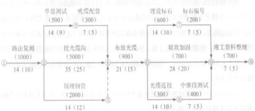 问题 某本地网直埋光缆线路工程,光缆路由与原有光缆有一处交越。施工单位和建设单位签定了承包合同,对工程材料、交越手续等进行了详细约定,项目部根据合同约定,编制了施工进度网络计划(如下图)并报送监理单位。 参数说明:箭线上括号内数字为压缩该工作一天所增加的费用,箭线下括号外数字为本工作的持续时间,括号内数字为该工作能够压缩到的最短持续时间。 由于前面工作进度拖延,工程进行了60天,布放光缆工作才开始。项目部采取了赶工措施,工程如期完成。 项目部对工程进行交工前检查时,发现部分段落的光缆对地绝缘不合格,经检查,该问题系部分接头盒进水所致,整改后工程/顷利交付。 问题 1.计算本工程工期,并列出关键工作。 2.工程进行了60天,为了赶工应进行工作压缩,列出压缩步骤,并计算因为赶工增加的费用。 3.从布放光缆工作开始,画出压缩后的施工进度网络图,指明各项工作的持续时间并用双箭线标出关键路径。 4.在与原有光缆交越处施工时,为保障原有光缆的安全,应采取哪些措施? 5.说明可能造成光缆对地绝缘不合格的原因。 6.应如何保证光缆接头盒的封装质量?