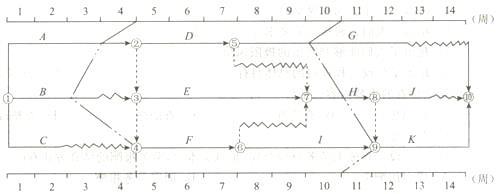 下图所示的工程双代号时标网络计划,执行到第4周末及第10周末时,检查其实际进度如图中前锋线所示,检查结果表明( )。A、 第4周末检查时,工作B拖...
