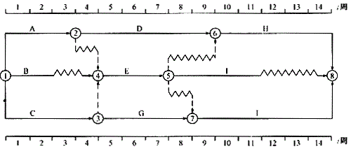 解析 本题主要考查总时差的计算。 某工序的总时差等于其最迟开工时间减去最早开工时间,或最迟完工时间减去最早完工时间。E工作有紧后工作有HIJ,紧前工作有ABC,E工作的最早开工时间为不影响总工期情况下ABC工作最早完工时间的最大值,即E工作的最早开工时间是第4周末。E工作的最晚完工时间是不影响总工期情况下HIJ最晚开工时间的最小值,即第8周末。E工作持续时间为3周,所以E工作最晚开工时间为5周末(8-3=5)。E工作的总时差=最晚开工时间-最早开工时间=5-4=1周。所以C工作总时差为1周。 综上所述,本题正确选项是B项。