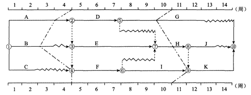 问题 下图所示的双代号时标网络计划,执行到第4周末及第10周末时,检查其实际进度如,图中前锋线所示,检查结果表明( )。 A. 第4周末检查时工作