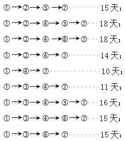 解析 本题主要考查关键线路。 关键线路是工作持续时间最长的线路。可以通过计算路线工作时间得到。 本题中共有9条线路,对应的工作持续时间分别为: 所以关键线路是工作时间为18天的两条线路。 综上所述,本题正确选项是B项。