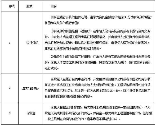 解析 本题主要考查履约担保金额。 履约担保的形式如下图: 在建设工程项目中,工程采购项目的履约担保金额一般为合同价的30~50%。 综上所述,本题正确选项是D项。