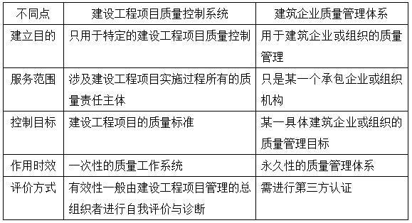 解析 本题考核的是项目质量控制系统的性质和范围。 建设工程项目质量控制系统是面向建设工程项目而建立的质量控制系统,它和建筑企业或其他组织机构按照GB/T19000标准建立的质量管理体系,有如下的不同点。 根据以上表格,ABC项均为建筑企业质量管理体系的特点,故ABC项错误。 工程项目质量控制系统的范围包括:按项目范围管理的要求,列入系统控制的建设工程项目构成范围;项目实施的任务范围,即由工程项目实施的全过程或若干阶段进行定义;项目质量控制所涉及的责任主体范围。 综上所述,本题正确答案为D。