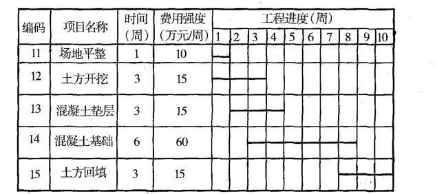 解析 如题表中所示,第三周的工作进度涉及土方开挖、混凝土垫层和混凝土基础三项工作,其费用强度分别为15万元/周.、15万元/周、60万 元/周,所以本周的施工成本计划值为:15 + 15 + 60 = 90(万元)。