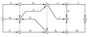 解析 本题主要考查双代号网络计划。 B项:双代号网络图中不可以出现多个起点节点和多个终点节点,本题存在9、10两个终止节点,所以终点节点的编制有错误,B项当选。 C项:双代号网络图中不可以出现闭合回路,本题4、5、6节点组成了闭合回路,所以存在循环回路错误,C项当选。 D项:本题有两个8节点,节点编号重复错误,D项当选。 E项:双代号网络计划图节点编号可以不按顺序编制,但箭头指向编号应大于箭尾编号,本题中G工作,由6节点指向4节点,节点编号存在错误,E项当选。 A项:图中只有一个起始节点,不属于本图中的错误。A项不当选。 本题为选非题,综上所述,本题正确答案为BCDE。