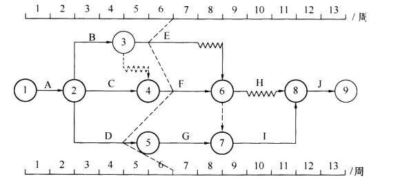 解析 由于TFE=LFE-EFE=LSI-EFE=8-7=1,第6周检查该进度计划时E工作拖后一周,因此E工作没有总时差了。