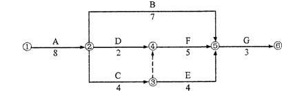 解析 本题考核的是双代号网络计划有关时间参数的计算。 自由时差等于紧后工作的最早开始时间减去本工作的最早完成时间,图中,工作A的紧后工作是工作B、工作C、工作D,工作D和工作C的紧后工作是工作F,由标号法易得总工期为20天,关键线路为:A-C-F-G,工作F的最早开始时间为12,工作D的最早完成时间为10,所以工作D的自由时差为2天。 综上所述,正确选项为B。