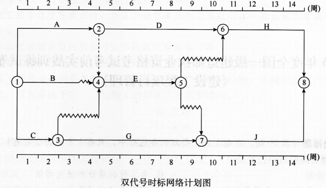 某工程双代号时标网络计划如下图所示,其中工作B的总时差和自由时差(  )。A.均为2周B.分别为2周和1周C.均为3周D.分别为2周和3周