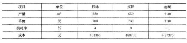 问题 商品混凝土目标成本为45360元,实际成本为488735元,比目标成本增加37375元,详细资料如下表所示。错误的是()。