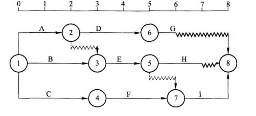 解析 由该双代号时标网络图可以看出,C—F—I为关键线路,A最早完成时间EFA=2, 最迟完成时间LFA=min{LSD,LSE)=min{4,4)=4,所以TFA=4-2=2。所以C正确。