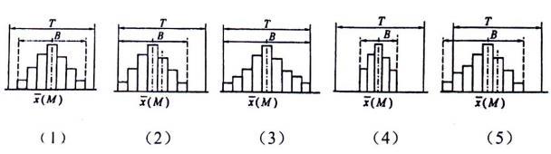 选项 A.图(l)显示生产过程的质量正常、稳定、受控 B.图(3)显示质量特性数据分布达到质量标准上下限,质量能力处于临界状态 C.图(4)显示质量特性数据的分布居中,质量能力偏大,不经济 D.图(5)显示质量特性数据超出质量标准的下限,存在质量不合格情况E.图(2)显示质量特性数据分布偏上限,易出现不合格