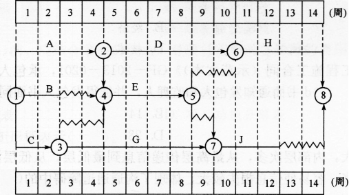 某工程双代号时标网络计划如下图所示,则工作8的自由时差和总时差(  )。A.分别为2周和4周B.均为2周C.均为4周D.分别为3周和4周