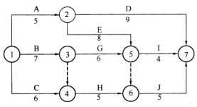 选项 A、网络计划中两项虚工作的自由时差都为O B、关键线路有两条 C、计算工期为17天 D、工作B的最迟完成时间为第7天 E、工作H的总时差为0