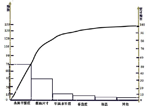 对某构件施工精度进行抽样检查,发现表面平整度、截面尺寸、平面水平度以及垂直度、标高等方面存在质量问题,经统计分析得到的累计频率曲线图如下所示,则导致该...