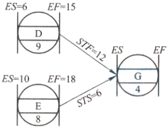 在单代号搭接网络图中,工作G的持续时间为4天,紧前工作有D、E工作。工作D—G之间的搭接关系为STF一12天,工作E—G之间的搭接关系为STS=6天,D、...