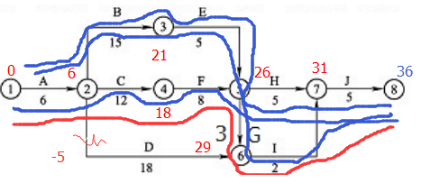 解析 教材 图中关键线路一共四条。 关键线路1:①→②→③→⑤→⑦→⑧ 关键线路2:①→②→④→⑤→⑦→⑧ 关键线路3:①→②→④→⑤→⑥→⑦→⑧ 关键线路4:①→②→③→⑤→⑥→⑦→⑧