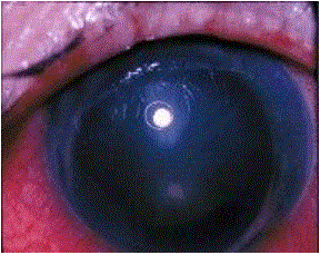 女,25岁,右眼外伤1天。检查右眼视力0.06,结膜混合性充血,角膜水肿,晶状体混浊(如图),前房浅,眼底不清,眼压38mmHg,该患者最有可能诊断是( ...